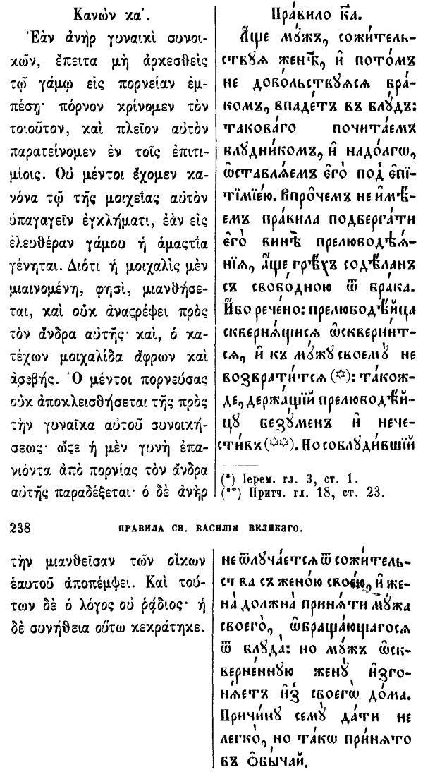 Вальсамон. О блуде и прелюбодеянии читай 5-ю главу 13-го титула настоящего собрания и указанные в ней правила и законы. Здесь же Святой называет блудником, а не прелюбодеем, того, кто имеет жену и вступит в связь с другою свободною женщиной; а замужнюю женщину, если она смесится с каким бы ни было другим мужчиной, называет прелюбодейцею, присовокупляя, что муж не должен быть принуждаем против воли принять ее в свой дом, а может тотчас же развестись с нею; но мужа, учинившаго блуд, блуд не отделяет от законной его жены. По какой причине так установлено, этого, говорит, понять не легко. Заметь из настоящаго правила, что блуд не однообразен и врачуется не одними и теми же епитимиями; ибо имеющий жену и согрешивший блудом должен быть подвергнут большей епитимии, чем тот, кто не имеет жены и впадет в блуд; а это большее в епитимии предоставлено на усмотрепие духовного врача.
