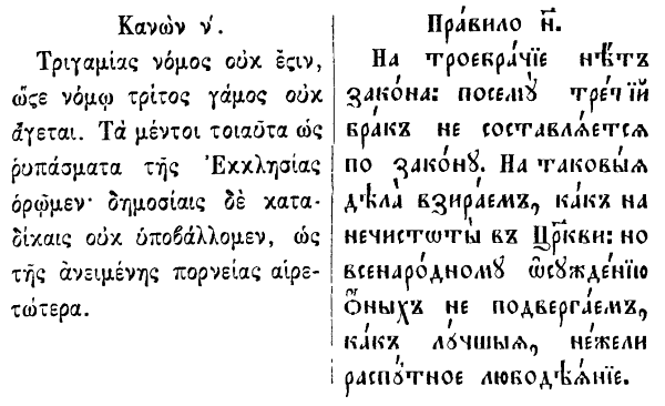 Зонара. И в 4-м правиле сей святый отец сказал, что троебрачие именуется многобрачием, а не браком, или, скорее, наказанным блудом; а здесь назвал оное нечистотою в церкви. Впрочем, говорит, всенародно, т. е. явно и без обиняков, не осуждаем и не требуем, чтобы такое сожительство расторгалось; а не расторгается потому, что сравнительно с распутным любодеянием, т. е. не наказанным переходом от одной жены к другой, оно предпочтительнее, так как хотя и есть блуд, но обузданный, потому что муж довольствуется одною женою. А слыша, что «закона на троебрачие нет», разумей церковный и духовный закон; ибо на основании новеллы Константина Порфиророднаго дозволяется и третий брак, впрочем с ограничениями и епитимиями.