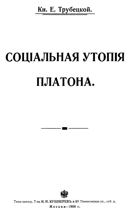 Сказанного достаточно для оправдания моей темы и моего посвящения. Изо всех продуктов творчества Платона я останавливаюсь на его социальной утопии. Я делаю это во-первых потому, что именно она осталась всего менее исследованною и оцененною моим русским предшественником. Во-вторых, именно она всего лучше объясняет нам как его, так и нашу жизненную драму.